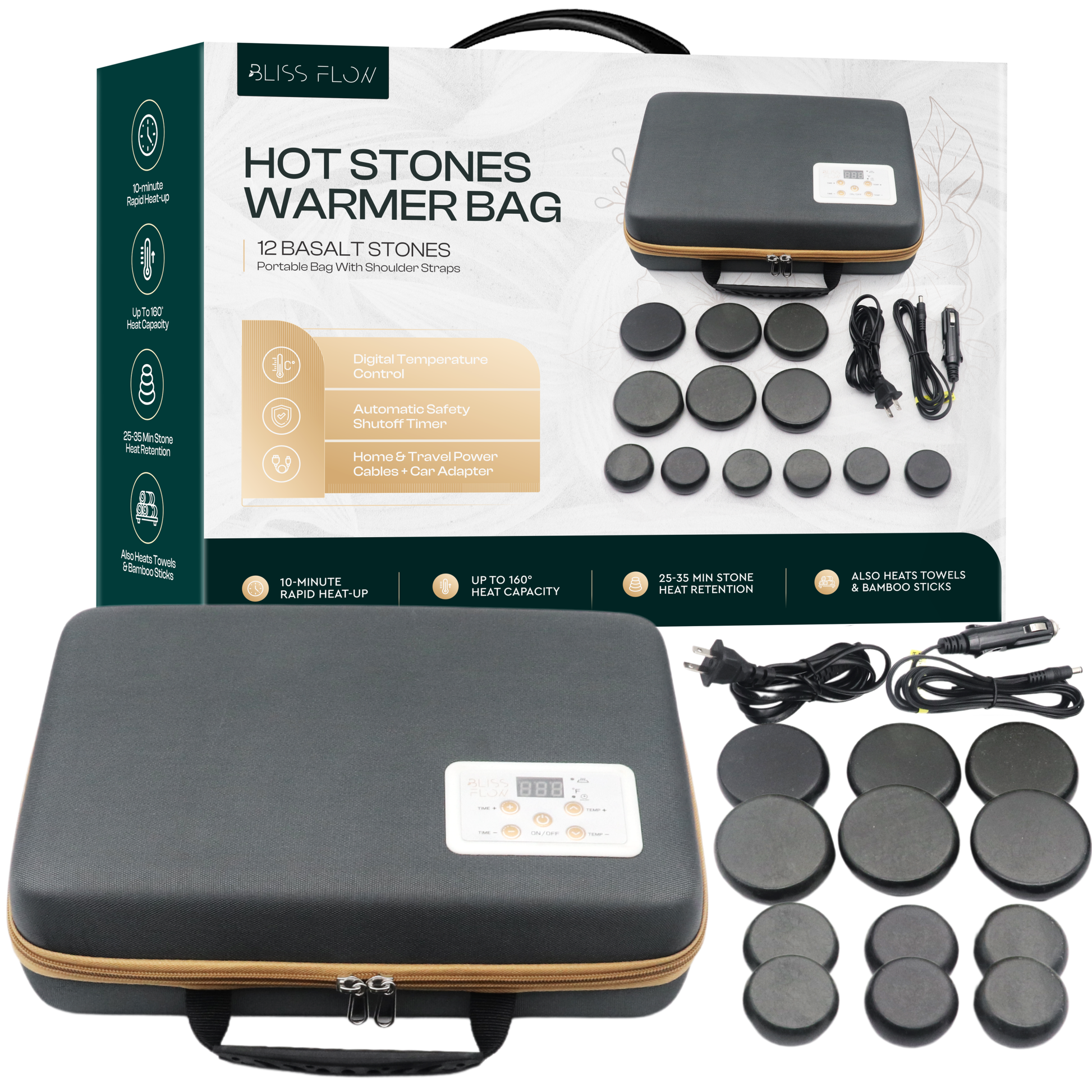 - PORTABLE AND POWERFUL: The BlissFlow massage stone warmer set includes a compact electric heating bag that allows you to heat up to 12 basalt stones on-the-go for relaxation anywhere.